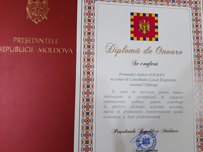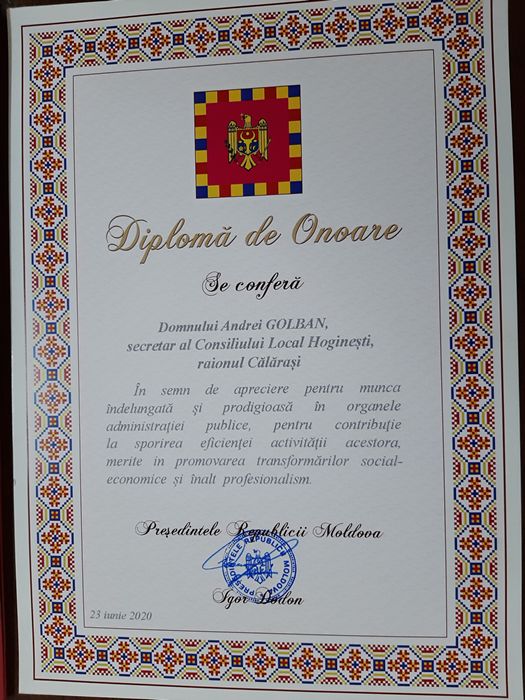 Recent Domnul Andrei Golban a fost decernat cu Diploma de Onoare a Presedintelui Republicii Moldova, in semn de apreciere pentru munca Indelungata depusa in organelle adminisratiei publice.