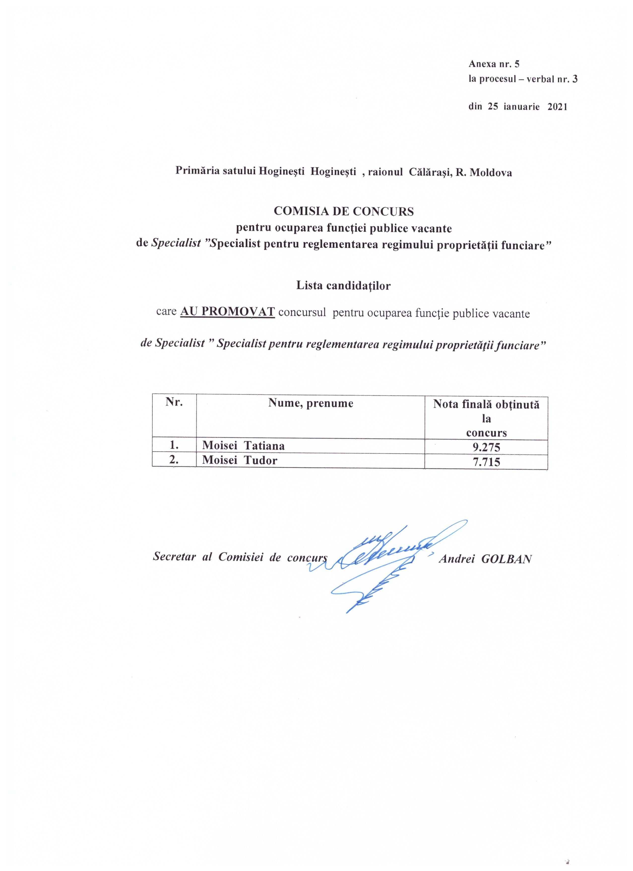 Comisia de concurs la postul vacant de specialist pentru reglementarea regimului proprietății funciare